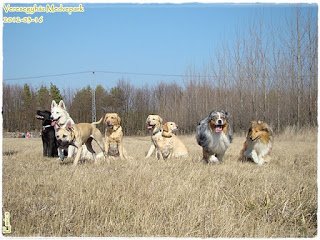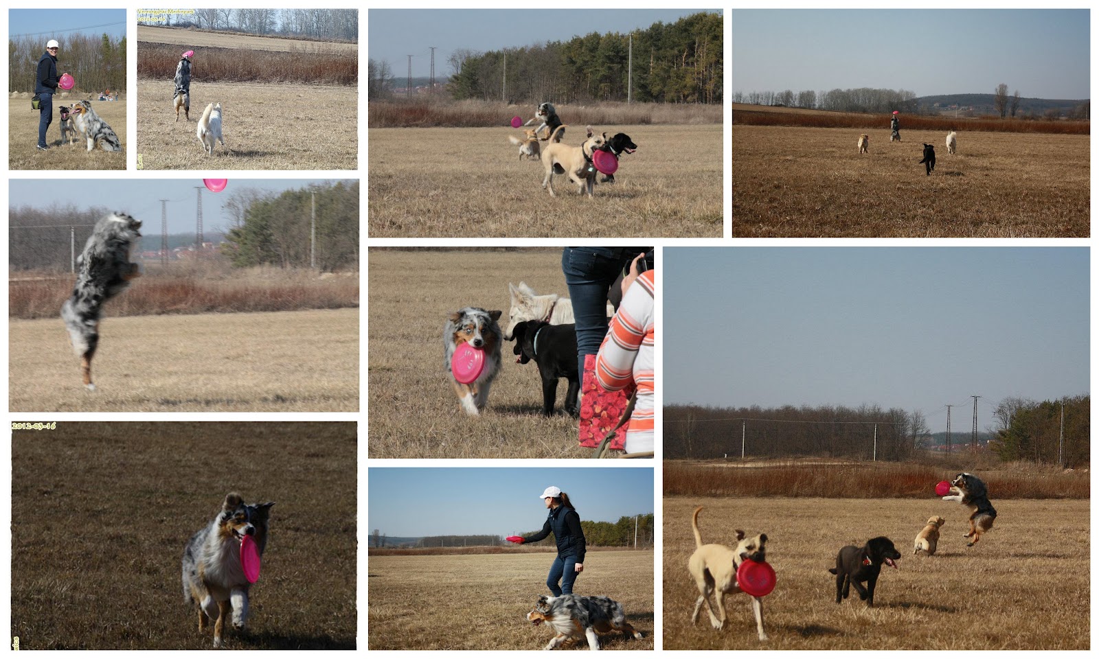A nagy farkasosdi után jött egy kis pihenés. Rengeteg szabad terület van a Medvepark környékén, egy szántóföldre gyalogoltunk, ahol elengedtük a kutyákat. Mi ettünk, ittunk, kutyák kergetőzésben, játékban vezették le fölös energiájukat. Remek kis kikapcs volt ez mindenkinek, elterülhettünk a fűben, és megbeszéltük az eddig látottakat. Aztán előkerült a frizbi, ami beindított mindenkit, hogy kipróbálja. Nem is tudom hányszor repkedtek a rózsaszín korongok, és hány kutya szájában fordultak meg. Néhány kép, mely tanúsítja a kutyák jó kedvét.