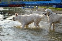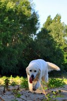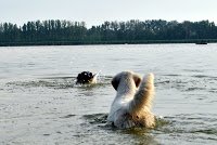 Dobálgattunk egy-két botot, kutyákok szinte az egész időt a vízben, partján töltötték. Damon viselkedése, morgás kíséretében eltulajdonított játék, egyre kevesebbszer fordult elő, és ami még jobb, hogy egy-egy rászólás elég is volt neki, hogy rögzüljön benne az új szabály. Ingrid kissé hátrányba szorult a fickókkal szemben, így volt hogy csak őt engedtük a dummyért, fontos, hogy a kutyának legyen sikerélménye. Melyik kutya menne örömmel a bedobott dologért, ha mindig másik kutya kaparintja meg előle?! Orsi másodszor csobbant a két goldival, nekem több sem kellett, kutyám hisztije mellett kattogtattam, aminek egész jó képek lettek az eredményei.