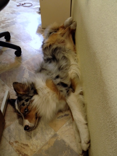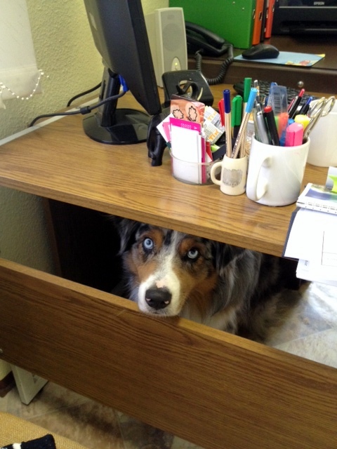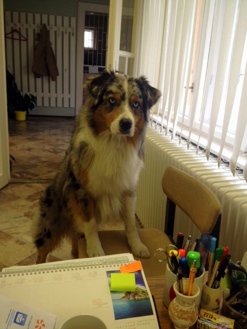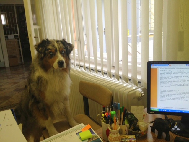 Ha bent van, akkor azon szoktunk mosolyogni, hogy milyen fekvési pózokat alkalmaz a falnál, miket álmodik, megy a nyüsz-nyüsz, majd a morgás 🙂 , amikor 15 perccel a a munkaidőm vége előtt, odateszi az asztalomra a fejét, hogy akkor menjünk már!! 🙂