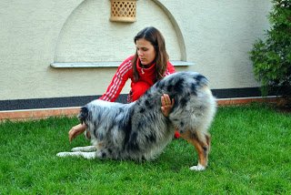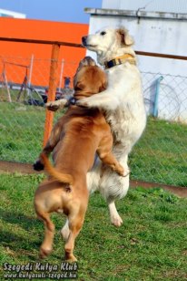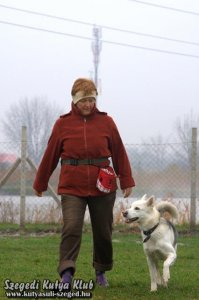 Kriszta és Maxim munkájukban is sokat változtatott a póráztalanság persze jó irányban. A nagy vörös kutya (egyik kedvenc Walt Disney filmeim egyike) felszabadultan mozgott Kriszta mellett, még talán a fránya fekvés is gördülékenyebben ment. Anita és Mex a szétesések szétesését mutatta be, illetve csak Anita. Szerencsére Mex vagy már hozzászokott, vagy most nem foglalkozott ezzel a körülménnyel különösebben. Az ő párosukban főként Anitának kell gyúrnia magát, hogy ne legyen ideges ilyen helyzetekben, mert sokat árthat ezzel a munkájuknak. Ezen kívül a szemkontaktot említeném meg náluk, amire az ő párosuk folyamatosan gyúr, mert Mex valahogy nem érzi jól magát, amikor a gazdira kell felnéznie. Gyorsan lesüti a szemét, korábban azt javasoltuk nekik, hogy menjenek vissza a szemkontakt kialakításához, azaz az alapokhoz és kezdjék el újra a felépítést. Vasárnap én láttam a változást, Mex igaz, hogy csak rövid ideig, de többször is fel-felnézett Anitára. Ez már félsiker!!! Dávid és Dante párosa ismét megmosolyogtatott, amikor Dante megmakacsolta magát és semmi pénzért nem akart lefeküdni. De tényleg!!! Én is megpróbáltam, kapott olyan fini kajcsit, amitől még én is leheveredtem volna a hideg földre, de nem ment. Nem tudom, hogy itt most a sok kan kutya jelenléte a pályán, vagy tényleg a hideg időjárás volt a gond. Mert azt el kell mondanom, hogy otthon, ház előtt pikkpakk lefekszik még esős időben is. Szóval egy nagy kérdőjel volt Őkelme számomra. Dávid szétszórtsága nem könnyítette meg a vezénylésemet, valamint a kutya munkáját. Azt javasoltam, hogy térjenek vissza ahhoz a módszerhez, amit Gabi a vizsga előtt 2 héttel javasolt nekik, hogy mindig óriási pozitívum legyen a kutyának az engedelmes gyakorlás, mert nem láttam Dante szemében lobogni az együtt dolgozás örömlángját.