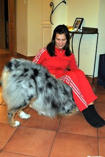 | Maxim játékra hívása, elégedett gazdi, Kriszta arca a háttérben |