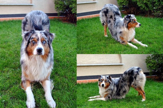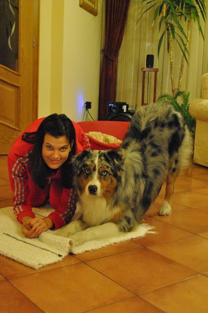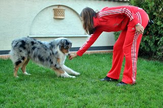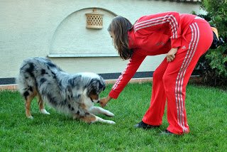 A soron következő trükk a “meghajlás” avagy ahogy én hívom a “játszik” trükk. Nem tudom nekem erről a pózról hamarabb jut eszembe a kutyák játékra hívó testtartása-mellkas a földön, fenék, farok (már akinél van 🙂 )a magasban-, mint a meghajlás :). Ez az első trükkjeink között volt és már nem is nagyon emlékszem, hogyan is sikerült kihoznom Jamieből ezt az egészet. 🙂