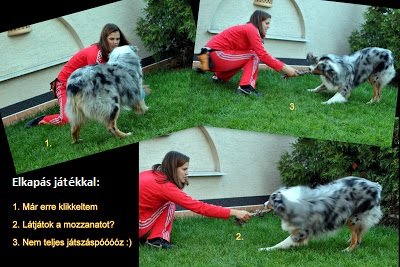 Láttam olyan videót, amin egy játék közepette mutatta be a gazdi a trükköt. Alapállás, kutyával játszunk, húzogatós játék, azaz kötél, vagy bármi egyéb, amit a kutya is és mi is meg tudunk fogni. A gazdi ül, guggol, lényeg, hogy a kutya szintjén legyen, aztán a vad játékban, mondjuk ne akkor, amikor a kutya épp ráncigálja, tépi a játékot, hanem amikor csak húzza, azaz ellenállást ad, akkor mi felé és lefelé toljuk a játékot, mintha a két mellső lába közé akarnánk betolni. Ilyenkor kell nagyon résen lenni, mert az ebzetünk vagy tolatni fog, vagy lefeküdni, VAGY hajolni!!! Jupiii 🙂 Ebben az esetben én inkább használnám a klikkelő szót, ami hasonlóan van belőve, mint maga a klikk hang, lényeg, hogy ütős és rövid legyen. Ilyenek a jó, úgy, bravo, stb szavak. Ez azért praktikusabb, mert én speciel két kézzel fogtam a rongyot az esetek többségében.