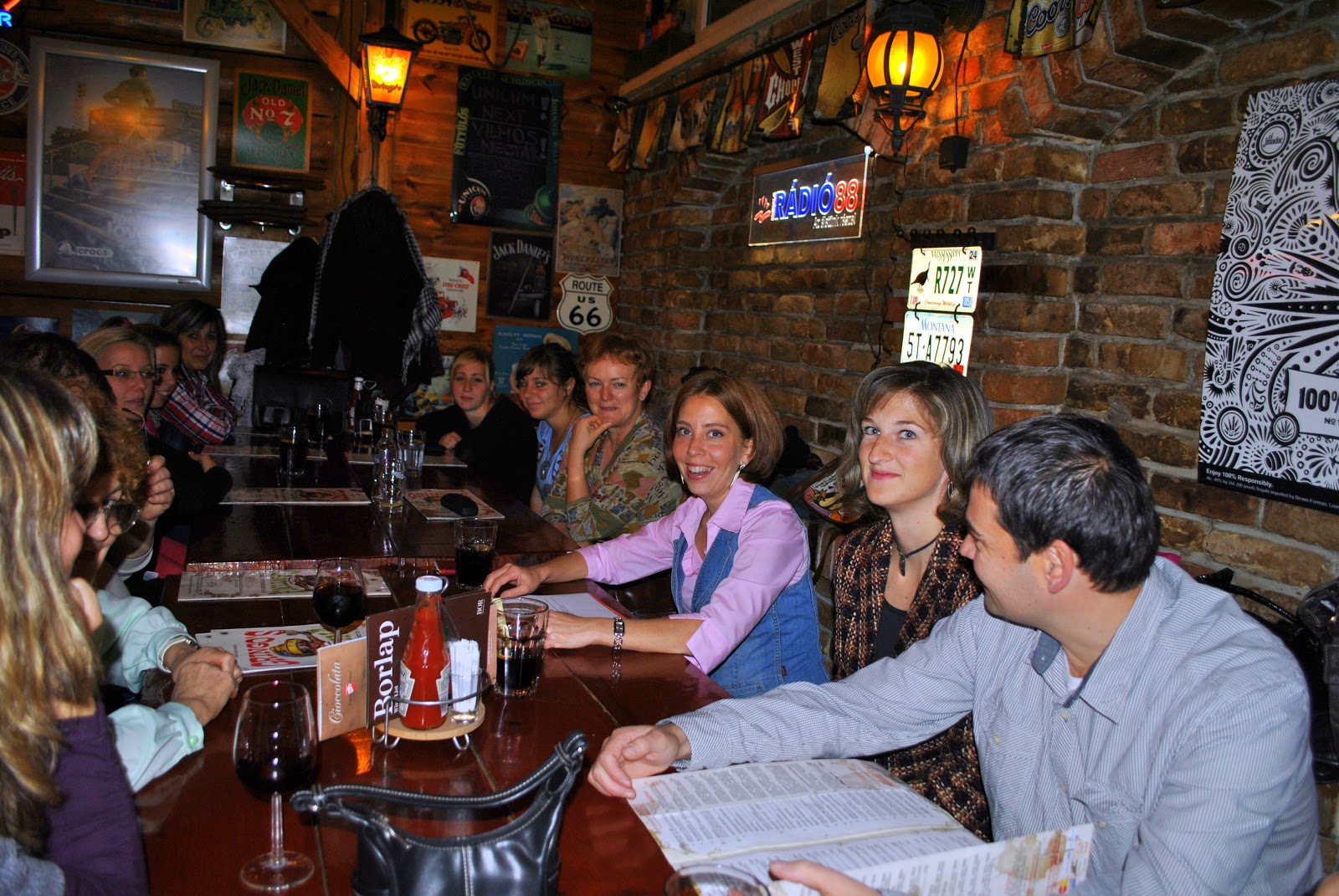 Útközben felvettem Adrit és Kittit, akik kicsit csencseltek maguk között ( kutyatáp és pénz cserélt gazdát- nem kell rosszra gondolni) aztán pontban 18:00-ra megérkeztünk a helyszínre. Még parkoló is volt a közelben, én voltam a legboldogabb. Aztán beléptem és rájöttem hogy a 18:00 órát majdnem csak én vettem komolyan, Panka és Zoli már elhelyezkedett, velünk együtt Panka szülei is megérkeztek, azaz elég foghíjasak voltunk a megbeszélt időben. A notórius késők mellett még sokan hiányoztak… Lassan mindenki beszállingózott 30 percen belül, majd kezdetét vette egy kis hivatalos megbeszéléssel a szolid összejövetelünk. Szegény Pankának nem csak a hely zajával kellett megbirkóznia, hanem olykor-olykor a mi “szánkatbefogninemtudó” képességünkkel. Viccesen már majdnem hallgatásra intettük az egész helységet, hogy hallhassuk Panka mondandóját.