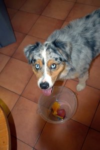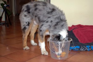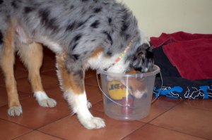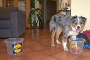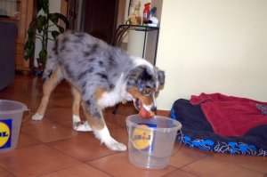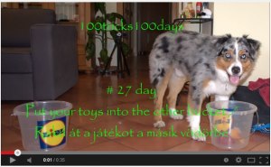 Először fogtam és beletettem két egykor csipogóval rendelkező játékot a vödörbe, és megkértem vezényszó segítségével “fogd”, hogy vegye szájába a tárgyat. Majd a másik vödörre mutattam és kértem a “tedd bele” parancsot. Ahogy említettem ezeket ismerte Jamie, csak ebben szituációban volt számára újdonság…
