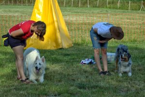 A végére maradt pár szinkron trükk, mint meghajolt kutyák égbemeredő stabil fenék kihasználása egy-egy játék ráhelyezéssel. De a pakolós játék, azaz Jamie 3 tárgy bevitele és letétele a vödörbe, majd Aminah átpakolása a másik vödörbe, is nagyon tetszett a közönségnek.