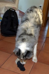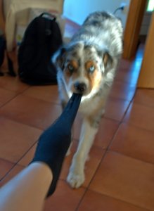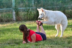 A legnagyobb… feladat Jamm el szeretné húzni Aminah-t, aki lecövekelt Zsuzsi kérésére fekvésben… Azok a fejek!! :O Fotót készítette: Domvári Zsuzsi |
