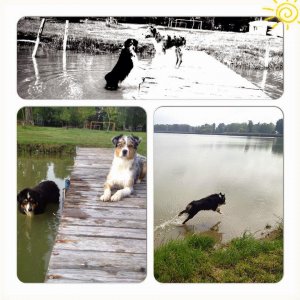 Miután mindenki kiterelte magát, elmentünk pacsálni, a feltöltés alatt álló tóhoz. A kissé zavaros, agyagos víz remek lehetőséget nyújtott lehűteni a kutyákat. Akik játszottak, járőröztek, vagy épp, mint Jamie üldözte szerelmével Meggy-t, Petra legfiatalabb borderét. 🙂 De olyan is akadt, hogy az én drága jó kutyám elszaladt leellenőrizni a birkákat. Ott voltak azok még Jamm…