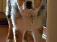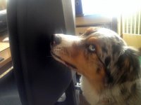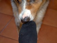 Ez egy minden téren érdekesre sikeredett trükkünk. Jamie tudja magát ülve szégyellni, igaz nem úgy ahogy szeretném, kicsit kapkodik a cselekedettel, azaz nem tartja ott a fejét a mancsa alatt. Mindegy ezt megtanultam már elfogadni, sokat kísérleteztem, hogy akkor fogadom el, ha hosszabb ideig tartja, de ekkor ő is és én is beidegesedtem, mert káosz…